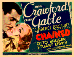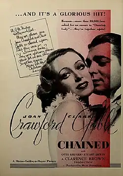 Chained is a 1934 American drama film directed by Clarence Brown and starring Joan Crawford and Clark Gable with supporting performances by Otto Kruger, Stuart Erwin, Una O'Connor and Akim Tamiroff. The screenplay was written by John Lee Mahin, Albert Hackett and Frances Goodrich based upon a story by Edgar Selwyn.[2] Ward Bond and Mickey Rooney appear briefly in uncredited roles.