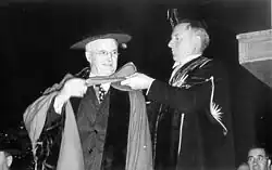 ![]() Chalmers Jack Mackenzie (on left) receiving honorary degree from the University of British Columbia. October 1947 | |