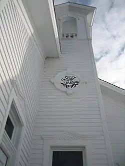 The bell tower rises 43 feet (13 m), and halfway up its length is a large round sign. The sign denotes the school district, Pine Rock, and the year of the school's foundation. Originally, the sign graced the front exterior wall of the larger of the two rooms. The tower rises above the roof by about fifteen feet and at its top are four arches, one on each side.[6] Wooden construction is found throughout the tower, its arches, and the rest of the schoolhouse, save the limestone and cement foundation.[3] At the bottom of each of the four arches are balustrades decorated with spindles. Inside the tower is the school bell. The bell house is topped with a multi-gabled roof. The roof of the overall schoolhouse is covered with cedar shingles and features chimneys rising from each of the classrooms.[6]