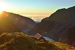Chancellor Hut is an alpine hut in the Southern Alps of New Zealand. It is located on the Chancellor Ridge near the edge of a cliff, 200 metres (660 ft) above the Fox Glacier, at an altitude of 1,260 metres (4,130 ft) above sea level in the Westland Tai Poutini National Park.[1][2][3] The hut was built between 1930 and 1931, and is listed by Heritage New Zealand as a Category 2 historic place. It is the oldest hut in the Southern Alps still on its original site.[4] It is rectangular in plan, 7.4 by 3.4 metres (24 by 11 ft), has timber-frame walls clad with corrugated iron and a gabled corrugated iron roof. Inside, the hut has tongue and groove timber flooring, with two cooking benches in the main room with a door leading to the bunk room with 12 bunks.[4][3]