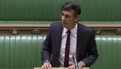On 17 March 2020, Sunak introduced a programme providing £330 billion in emergency support for businesses,[27] as well as a furlough scheme for employees. This was the first time a British government had created such an employee retention scheme.[28][29] The scheme was introduced on 20 March 2020 as providing grants to employers to pay 80% of a staff wage and employment costs each month, up to a total of £2,500 per person per month.[29] The cost has been estimated at £14 billion a month to run.[30] The Coronavirus Job Retention Scheme initially ran for three months and was backdated to 1 March. Following a three-week extension of the countrywide lockdown the scheme was extended by Sunak until the end of June 2020.[31][32] At the end of May, Sunak extended the scheme until the end of October 2020. The decision to extend the job retention scheme was made to avoid or defer mass redundancies, company bankruptcies and potential unemployment levels not seen since the 1930s.[33] After a second lockdown in England on 31 October 2020, the programme was further extended until 2 December 2020,[34] this was followed on 5 November 2020 by a lengthy extension until 31 March 2021.[35] On 17 December 2020, the programme was further extended until 30 April 2021.[36] In the 2021 budget held on 3 March 2021, Sunak confirmed that the scheme had been extended once more until 30 September 2021.[37]