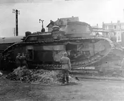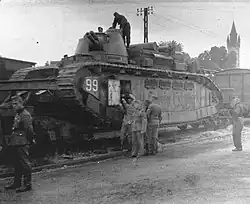 French command was aware that this reputation was undeserved. When the German Panzerdivisionen, in the execution of Operation Fall Rot, breached the French lines after 10 June 1940, the decision was made to prevent the capture of the famous equipment. On 12 June 1940 the order was given to send the tanks south by rail transport. The broken down tanks N° 92 and 95 were destroyed, at Mairy-Mainville and Piennes respectively. The six remaining tanks hastily embarked on two trains at the station of Landres on 13 June. During the night they hid, still loaded, in the forest of Badonviller. As no orders had been received regarding their destination, they remained at this spot during the 14th, being bombed in the early afternoon but without incurring any damage. In the late afternoon, an order arrived to send the tanks to Neufchâteau which was reached in the early morning of 15 June. There it was decided to travel to Dijon.[13] However, fifteen kilometres south of Neufchâteau near the Meuse-sur-Meuse station,[14] in a curve of the railway, the track was blocked by a blazing fuel train, while other trains jammed the exit to the rear. Due to the curve, it was impossible to unload the tanks. To prevent a capture of the matériel by the enemy, it was ordered to destroy the vehicles. Charges were placed and the fuel pipes cut. The gasoline was lit and the tanks exploded around 19:00. The crews escaped to the south.[13] The wrecks were subsequently discovered by the 8. Panzerdivision. Later Joseph Goebbels and Hermann Goering claimed that the tanks had been destroyed by German dive bombers. This German propaganda myth was accepted as an authentic event by contemporary writers and later repeated in many postwar sources. One tank, the Champagne, was nevertheless captured more or less intact and brought to Berlin to be exhibited as a war trophy until disappearing in 1948. After the war, rumours circulated that this vehicle had been transported to the Soviet Union.[15]