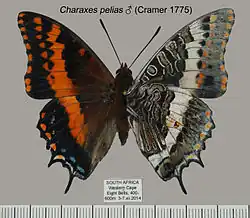 - ^ Coetzer, B.H. (2020) [amended version of 2020 assessment]. "Charaxes pelias". IUCN Red List of Threatened Species. 2020: e.T161317258A175063254. doi:10.2305/IUCN.UK.2020-2.RLTS.T161317258A175063254.en. Retrieved 8 August 2021.