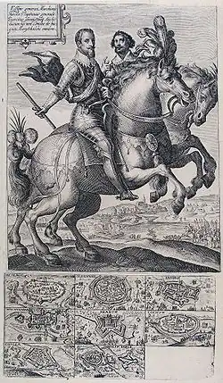 Engraving by Chrispijn van der Passe showing the conquests and the equestrian portrait of Ambrogio Spinola, with the Count of Bucquoy riding by his side