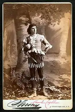 In 1876 Augustin Daly brought Coghlan to America where he would spend the greater balance of his career. He made his Broadway debut on 12 September 1876, at the Fifth Avenue Theater, as Alfred Evelyn in Lord Lytton's Money and was an instant success. Two months later, at the same venue, Coghlan played Orlando opposite Fanny Davenport's Rosalind in Shakespeare's As You Like It.[7] The next season Coghlan was engaged as the leading man at the Union Square Theater, where he played Jean Remind during the successful run of Augustus R. Cazauran's The Celebrated Case. He returned to London in 1881 to play Col. Woods, U.S.A. in the long-running The Colonel, produced at the Prince of Wales. On 13 December 1890 Coughlan was declared bankrupt.[8] He had liabilities of £315.[9] The pinnacle of Coghlan's near twenty-five-year career in America came on 2 December 1898, at the Fifth Avenue Theater in his own adaptation of the Dumas' play Kean titled The Royal Box, in which he played the part of the actor Clarence. This great success was tempered the following year by the failure of his play Citizen Pierre, in which he made his last New York performance. During his career Coghlan had played opposite his sister, Rose Coghlan, and in support of Lillie Langtry and Minnie Maddern Fiske. His last appearance on the stage was at Houston, Texas, on 28 October 1899, as Clarence in The Royal Box.[5][6]