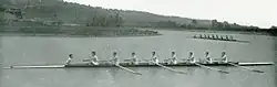In 1883, Charles Courtney took over as coach of the Cornell University rowing team. Courtney's crews never finished below third and won 14 of 24 varsity eight-oar titles at the Intercollegiate Rowing Association Championship Regatta. In seven of the regattas, his team won all the events, including the varsity eight, varsity four, and freshman eight. During Courtney's tenure as coach, no other school would sweep every event in the regatta.[29] Before becoming coach, Courtney did have a history with Cornell University. In 1872, he participated in the first Cornell rowing regatta as a member of the Union Springs Boat Club. Courtney's four-oared crew from Union Springs beat Cornell, but helped build excitement at the college for rowing. Courtney also won a two-mile (3 km) single scull race on the same day.[30][31]