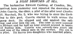 On 28 January 1890, John J. Canvin Sr., boarded the barquentine Edward Cushing of Camden, Maine, from the pilot-boat Charles H. Marshall, No. 3. He drowned when he was trying to steer the barkentine off Highland Light into port. He slipped over the railing into the sea. Efforts to find him showed that he had drowned. He was 68 years old and one of the oldest pilots in the service.[12]