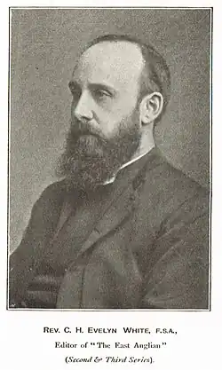 In 1885 Evelyn-White relaunched the East Anglian, an antiquarian journal which was a revival of an earlier journal, The East Anglian Notes and Queries, founded by Samuel Tymms in 1858 under the auspices of the Suffolk Institute of Archaeology. In the same year he edited a new edition of The Journal of William Dowsing, the seventeenth century iconoclast employed by the roundheads to demolish the "superstitious pictures and ornaments of churches" under the auspices of the eastern Counties.