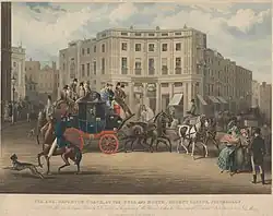 Hunt's 1829 engraving titled The Age, Brighton Coach, at the Bull and Mouth Regent Circus