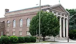 Barber designed or codesigned over 50 churches in his career.[13] His earliest church, the First Christian Church (1915) on Fifth Avenue, contains Neoclassical and Romanesque elements.[14] The church's dominant feature is its projecting pedimented portico, which is supported by Ionic columns. In 1929, Barber designed adjacent Sunday school and office buildings for the church, as well as a central courtyard with arcaded walkways connecting the three buildings. All three buildings are now contributing properties in the Emory Place Historic District.[14]