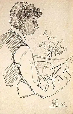 Back home again in Indianapolis and inspired by the art and entrepreneurship of Gookins, Fiscus was confident enough in his artistic abilities to hang up his shingle. The 1880 edition of Polk's Indianapolis City Directory listed a new business that year: Fiscus and Scott, artists, located at 69 Fletcher & Sharpe Block.[16] The business was a joint venture between the 19-year-old Fiscus and his fellow Bohemian, 17-year-old Scott. However, the business was short lived because Scott had applied to the Art Students' League in New York City and was accepted in 1881. Scott went to Paris in 1882, where he eventually gained notoriety as an artist in Europe before gaining worldwide attention.[17]