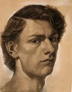 Fiscus became one of the early students at the ISA where he could take courses in drawing from love (freehand, perspective, and artistic anatomy) and courses from Gookins in painting (figure, landscape, and decorative painting in oil and watercolor) in the 11 rooms of the school.[6] Fiscus learned artistic techniques alongside other talented students such as William Forsyth, who would later gain fame as one-fifth of the Hoosier Group of artists. Fiscus thrived at the institution, "Charles Fiscus was among the most talented pupils of this early school. He was marked 'first' by the master more often than not and is still remembered by his fellow-students as having unusual ability."[7]