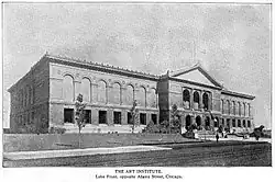 1902 exterior view of what is now the Allerton Building of the Art Institute of Chicago. Although the building was originally designed as a closed rectangle, it was initially constructed with a U-shaped footprint for lack of funds, with the area between the wings of the U in the back filled in 1895 with a temporary structure designed to house the classrooms of the School of the Art Institute. Alexander N. Fullerton Memorial Hall, with its Tiffany stained glass dome, was completed in 1898, and in 1901 the Ryerson Library was finished,[31] funded with a $50,000 donation ($1.8 million in 2024) provided by Hutchinson's friend Martin Ryerson.[32]