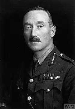 During the First World War, he served in various staff and command appointments.[11] Having re-joined his regiment, he was posted to France in August 1914 with the British Expeditionary Force as a company commander in the 1st Battalion, Devonshire Regiment.[1] In September 1914, he returned to being a staff officer attached to the General Staff, with the appointment of "deputy assistant adjutant and quartermaster-general" for the 3rd Division.[1][12] However, only one month later he took command of the 1st Battalion and led them during the Battle of La Bassée in October 1914.[2] On 18 February 1915, he was promoted to brevet lieutenant colonel as a reward for "services rendered in connection with Operations in the Field".[13] He then served as assistant quartermaster-general, first for the II Corps and then for the Third Army.[1] In August 1915, he was once more given a command, this time of the 13th Infantry Brigade, 5th Division,[1][2] and made a temporary brigadier general, taking over the brigade from Robert Wanless O'Gowan.[14] However, he was soon taken ill, and although he returned to command his brigade briefly, he then took months away from the front-line to recover: without this illness, he was likely to have gone on to command a division.[1]