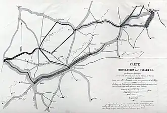 Minard created his "revolutionary"[2]: 40 first flow map in 1845 to inform the discussion about routing the rail line in the area between Dijon and Mulhouse. The map shows traffic on the pre-existing roads in the area. Two hundred copies of it were distributed to various stakeholders, and it dominated the debate among the deputies and engineers.[2]: 19