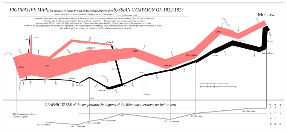 Minard is best known for his cartographic depiction of numerical data on a map of Napoleon's disastrous losses suffered during the Russian campaign of 1812 (in French, Carte figurative des pertes successives en hommes de l'Armée Française dans la campagne de Russie 1812–1813). The illustration depicts Napoleon's army departing the Polish-Russian border. A thick band illustrates the size of his army at specific geographic points during their advance and retreat. It displays six types of data in two dimensions: the number of Napoleon's troops; the distance traveled; temperature; latitude and longitude; direction of travel; and location relative to specific dates without making mention of Napoleon; Minard's interest lay with the travails and sacrifices of the soldiers.[4] This type of band graph for illustration of flows was later called a Sankey diagram, although Matthew Henry Phineas Riall Sankey used this visualisation 30 years later and only for thematic energy flow.