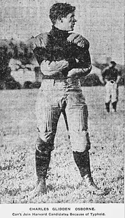After studying at Oxford, Osborne returned to the United States and enrolled at Harvard University. He played college football at the fullback position for Harvard Crimson in 1904 to 1905. In 1906, he was moved to the tackle position.[2] He helped lead the 1906 Harvard Crimson football team to a 10–1, the sole loss being a close game against national champion Yale. At the end of the 1906 season, he was selected by Caspar Whitney,[3] Charles Chadwick,[4] and The New York Times,[5] as a first-team tackle on the 1906 All-America college football team. Walter Camp named him to his All-America second team.[6] He was a player who reportedly "enjoyed the game himself every minute he was playing" and "played football purely for the fun he got out of it."[7] He also played for Harvard's cricket and association football teams and was a member of D.K.E., Hasting Pudding, Signet and Digamma clubs.[1][8]