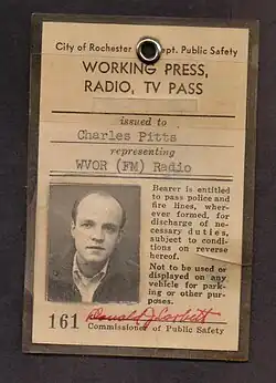 Charles Pitts (July 24, 1941 – May 21, 2015) was an American gay activist and radio personality. He co-hosted The New Symposium on New York City's WBAI from 1968 to 1969, the first weekly public radio program to offer an affirming discussion of homosexuality by openly gay hosts.[1] After the Stonewall Riots, he co-founded the Gay Liberation Front in New York City and continued his audio activism through the program Homosexual News.[2] From 1971 to 1973, his weekly WBAI show Out of the Slough broke barriers as the first freeform radio show centered on gay politics and culture.[3][4]