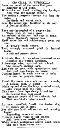 Poem by Purnell about the Jubilee Clock Tower in Christchurch, published in The Star on 27 May 1899[15]