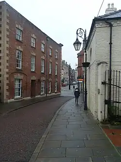 No. 14 dates to at least 1650.[6] While the large building on the left side of Charles Street when entering from the High Street was built by Thomas Penson, who lived in it. It served as the offices of the Wrexham Waterworks Company, and by the later 19th century under William Bernie, as a pawnbroker on its ground floor.[6] There is a narrow passage near the building, and between two buildings known as Cutler's Entry, named after the trade practices of the tenant of the house.[6]