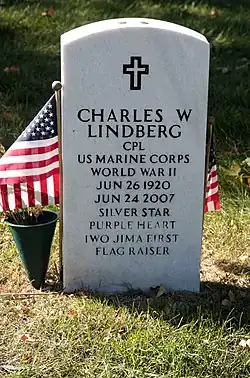 Charles W. Lindberg (June 26, 1920 – June 24, 2007) was a United States Marine Corps corporal who fought in three island campaigns during World War II. During the Battle of Iwo Jima, he was a member of the patrol which captured the top of Mount Suribachi where he helped raise the first U.S. flag on the island on February 23, 1945. Six days later, he was wounded in action.