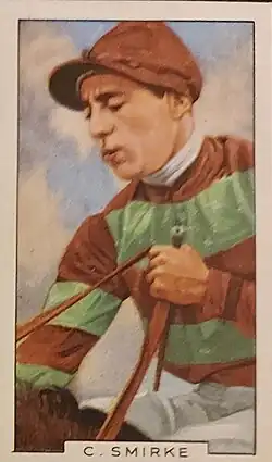 ![]() Charlie Smirke, in the colours of HH Aga Khan (Gallaher's cigarette card, 1936) | |