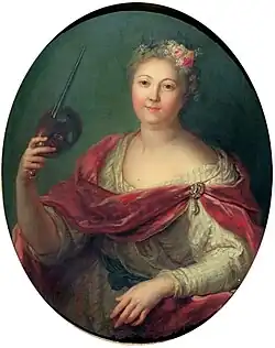 In modern historiography, there are two portraits of Desmares regarded as authentic.[21] One of them is a pastel by Charles-Antoine Coypel, dated to the 1720s, and published in 1733 as an etching by François-Bernard Lépicié; the pastel was mentioned in Desmares' inventory of 1746.[22] In Coypel's pastel, now presumed lost, Desmares is shown holding a mask and a dagger, indicating her abilities in comedy and tragedy, stressed in the quatrain on Lépicié's print.[23] An oil on canvas copy of the pastel, once attributed to Coypel and owned by the painter Pierre-Nolasque Bergeret, was acquired from the latter in 1827 by the Comédie-Française, where it remains.[24][25] Another authentic portrait of Desmares, painted by Jacques Aved, was listed in Desmares' inventory of 1753; it then passed to her daughter Charlotte d'Amour, remaining until the latter's death in 1783.[26]