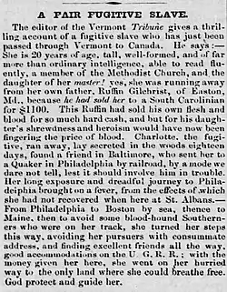 Gilchrist is said to have traveled via the Champlain Line, "an escape corridor between Albany–Troy, N.Y. and Quebec Province," entering Canada on a train departing Rouses Point, New York.[2] Gilchrist may have passed through St. Albans, Vermont.[3]