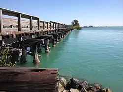 A number of bridges along the abandoned route also remain to this day as well, the most notable of which is the causeway over Gasparilla Sound that connected the line to the island. The southernmost trestle is now a fishing pier as is the northernmost trestle up to the abandoned drawbridge tower.[16] The rest of the causeway and trestles, which remain just to the south of the Boca Grande Causeway, are now completely abandoned. The center trestle's swing span is still in place and is locked open to facilitate boat traffic. The bascule span on the northernmost trestle was removed and reinstalled in 1988 over Reynolds Creek in Long Beach, New York on the Long Island Rail Road's Long Beach Branch, where it is still in service.[2]