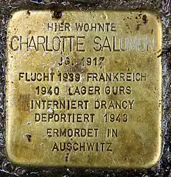 Since 1992 a primary school in Berlin bears the name of the artist, in 2006 a street in Berlin-Rummelsburg was named after her. On 21 April 2012 a Stolperstein in front of her former residential house in Berlin-Charlottenburg, Wielandstraße 15, was dedicated to Charlotte Salomon. In addition a Memorial Plaque on the facade of the building commemorates the artist.[55]