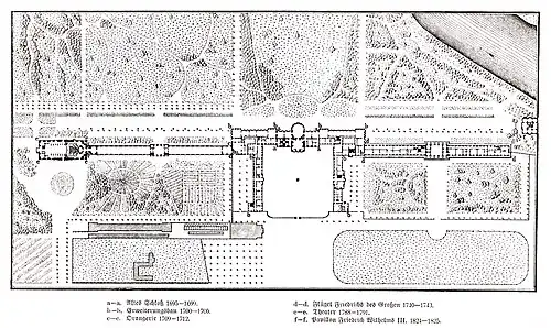 The garden was designed in 1697 in Baroque style by Simeon Godeau, who had been influenced by André Le Nôtre, designer of the gardens at Versailles. Godeau's design consisted of geometric patterns, with avenues and moats, which separated the garden from its natural surroundings. Beyond the formal gardens was the Carp Pond. Towards the end of the 18th century, a less formal, more natural-looking garden design became fashionable. In 1787, the royal gardener Georg Steiner redesigned the garden in the English landscape style for Frederick William II, the work being directed by Peter Joseph Lenné. After the Second World War, the centre of the garden was restored to its previous Baroque style.[11]