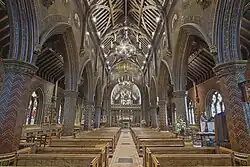 The 200 feet (61 m) spire of St Giles' Catholic Church dominates Cheadle's skyline.[5] Known as "Pugin's Gem",[9] it is considered to be the most complete expression of Pugin's beliefs about what a church ought to be, with everything in it having a practical and symbolic purpose.[5] The church featured heavily in local events celebrating the 200th anniversary of the birth of Pugin.