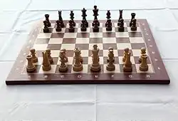 A chess set consists of a chessboard and white and black chess pieces for playing chess.[1] There are sixteen pieces of each color: one king, one queen, two rooks, two bishops, two knights, and eight pawns. Extra pieces may be provided for use in promotion, most commonly one extra queen per color. Chess boxes, chess clocks, and chess tables are common pieces of chess equipment used alongside chess sets. Chess sets are made in a wide variety of styles, sometimes for ornamental rather than practical purposes. For tournament play, the Staunton chess set is preferred and, in some cases, required.