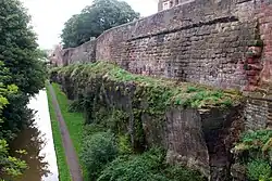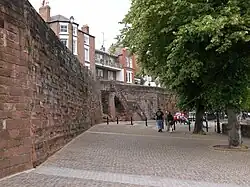 Nothing is known about the condition of the walls between the end of the Roman occupation in the late 4th century and the refounding of Chester by Æthelflæd as a burgh in 907 as part of the reconquest of Mercia by the Anglo-Saxons. Parts of the Roman walls were still present, as they continue to stand today.[8] The Anglo-Saxons certainly repaired the northern and eastern sections of the Roman walls. At some time Roman stones, including tombstones, were used in repairs, but it is uncertain whether this was during this period or later. There is evidence, including the discovery of a Saxon U-shaped ditch, that the wall was extended from the southeast corner of the Roman wall to the river, forming an L-shaped defence, but whether this would have been a stone or an earth defence is unknown.[4][9] There is a reference to repairing the walls in the Domesday Survey.[8] Following the Norman conquest the army of William the Conqueror arrived in Chester in 1069–70, and the king ordered that a castle should be built. This was constructed outside the site of the Roman fortress, to the southwest in an elevated position overlooking the River Dee.[10] This necessitated the extension of the walls to the west and south to incorporate the castle, leading to the circuit of the walls currently present. Three new gates were built, the Watergate in the west wall, and the Shipgate and Bridgegate. The latter two gates were certainly built by the 1120s, and it is thought that the medieval circuit of the walls was complete by 1162. They then consisted of the curtain wall itself, gates, towers and a ditch.[4][11] The Saxon ditch has been filled in, and the medieval ditches were dug further from the walls. The earlier ditch had been shallow, probably no more than 1 m (3 ft) deep. However, following a siege of Chester Castle during the Second Barons' War in 1265, a larger ditch was dug, this one being over 2 m (6 ft) deep.[12]