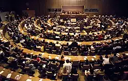 Chiara was invited to speak to a meeting of Italian politicians of various parties. It was 2 May 1996, in Naples. Her proposal to them was that, first of all, they should live fraternity among themselves and then bring this spirit to all their relationships with other politicians of different parties, with the goal that together they might achieve the common good. This gave shape to the Movement of Politics and Policy for Unity (MppU).[40] Chiara outlined its fundamental features on several occasions when she met members of the government in Slovenia, Spain, France, the Czech Republic, Brazil (1998) and Italy (2000).[41]