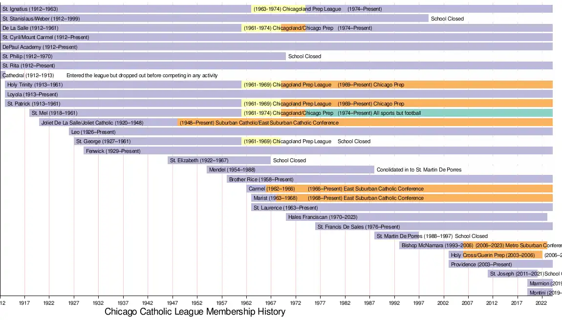 By the late 1950s some of the Catholic League members were growing restive, wanting to participate in the state tournaments sponsored by the Illinois High School Association (IHSA). The four Christian Brothers schools – De La Salle, St. George, St. Mel and St. Patrick – withdrew from the Catholic League and joined the IHSA upon its formation of the Chicagoland Prep League (CPL) on 27 February 1961. St. Ignatius would defect to the CPL two years later on 9 April 1963.[2][3]
