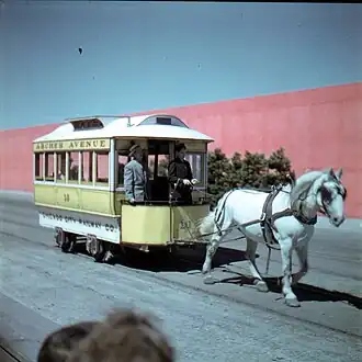 ![]() A horse-drawn Chicago City Railway trolley at the 1949 Chicago Railroad Fair | |