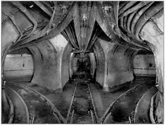 The 2 ft (610 mm) gauge track was laid in the tunnels, using rails 4+1⁄4 inches (110 millimetres) high (56 pounds per yard or 27.8 kilograms per meter). Crossties were not used. Instead, rails were mounted on chairs embedded in the concrete tunnel floor. Frogs and crossings were built on steel plates that were then embedded in the concrete floor.[10][11]