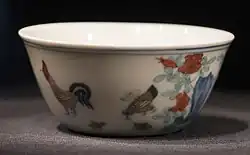 A Chicken Cup is a bowl-shaped vessel made of Chinese porcelain painted in the doucai technique. Chicken cups were created during the Ming dynasty (1368–1644), during the Chenghua Emperor's reign (1465–1487) in China, and originally functioned as a vessel to drink wine from. Chenghua Chicken Cups were created in an imperial kiln in the Jingdezhen porcelain factory, in Southern China.[1] The Emperor Chenghua had the Chicken Cup created in the 15th century as an act of devotion for his empress mother who was recorded to have an appreciation for small objects and valued a simple design taste.[2]
