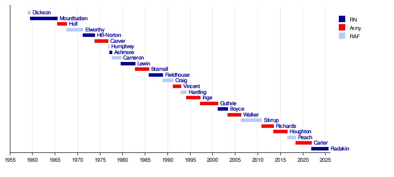 Tony RadakinStuart PeachNick HoughtonDavid Richards, Baron Richards of HerstmonceuxJock Stirrup, Baron StirrupMichael Walker, Baron Walker of AldringhamMichael Boyce, Baron BoyceCharles Guthrie, Baron Guthrie of CraigiebankPeter Inge, Baron IngePeter Robin HardingRichard Vincent, Baron Vincent of ColeshillDavid Craig, Baron Craig of RadleyJohn Fieldhouse, Baron FieldhouseEdwin Bramall, Baron BramallTerence Lewin, Baron LewinNeil Cameron, Baron Cameron of BalhousieEdward AshmoreAndrew HumphreyMichael CarverPeter Hill-NortonCharles Elworthy, Baron ElworthyRichard Amyatt HullLord MountbattenWilliam Dickson (RAF officer)