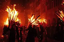 The origins of the custom are open to speculation. Often identified as a "pagan spring ritual" due to the archaic qualities of the fire spectacle, the earliest report of a procession of torch bearers dates to 1869.[1] A tradition of bonfires before Lent has a longer history of attestation, dating from at least the 16th century.
