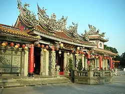 The temple is built with concrete decorated with stone sculpture. The front hall is dedicated to Three Sovereigns and Five Emperors, Kai Zhang Sheng Wang, the upper floor is dedicated to Wenchang Wang and the lower hall is dedicated to Avalokiteśvara.[1]
