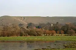 Child Okeford village and Hambledon Hill viewed from watermeadows by the River Stour