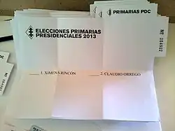 ![]() A primary was held on 19 January 2013 to determine the Christian Democratic Party's pre-candidate for the presidency. This primary was organized by the party and not under the new primary law. The contenders were Claudio Orrego and Ximena Rincón. Orrego won the primary with 59% of the vote.[17]