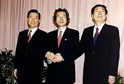 Korean President Kim Dae-jung, Japanese Prime Minister Junichiro Koizumi and Premier Zhu Rongji of the State Council of the People's Republic of China shaking hands at a meeting on November 5, 2001