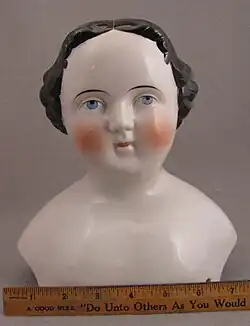 A typical china doll has a head made of glazed white porcelain, with painted molded hair and facial features.[4][2] The glaze gives the doll a characteristic glossy appearance.[4] The head is typically attached to a body made of cloth or leather, sometimes with arms and legs made of porcelain.[4] Some early china head dolls were placed on peg jointed wooden bodies. China doll parts were also sold for the customer to fashion a body and clothing.[4][2] Some cloth bodied china dolls could be more than 30" (76 cm) tall, and others as small as 3" (7.5 cm). Some china dolls, like the Frozen Charlotte dolls, were made entirely out of porcelain, with head and body made in one piece without any articulation.[4] The Frozen Charlotte dolls range in size from 2.5 cm (1 inch) in height up to 46 cm (18 inches).[2]