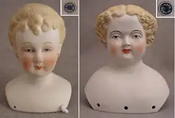 Parian dolls are similar to china dolls in that their heads are made of white untinted porcelain, but they are unglazed with a matte finish and typically have blonde hair.[10] They are found on similar body types. They were also mainly made in Germany, from around the 1860s to 1890s.[11]