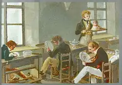 China painting became a fashionable hobby for wealthy young women in England in the 1870s.[63] This followed the establishment by Mintons of a pottery painting studio in Kensington that provided employment for female graduates of the nearby National Art Training School. Howell & James opened a gallery in Regent Street where they put on annual china painting exhibitions judged by members of the Royal Academy of Arts.[63] China painting also became popular in America. It was acceptable since it resembled other "parlor crafts" such as watercolor and glass painting.[2] At first, men dominated the field of china painting as an artform. Thus Edward Lycett, who had learned his art in the Stoke-on-Trent potteries of England, moved to America where, "the only place where painting of the finer kind was being done as a regular business was at Mt. Lycett's wareroom; and here many ladies resorted to study the methods employed and the materials required."[68] H.C. Standage wrote in Letts's Household Magazine in 1884,