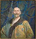 In chinoiserie fashion of the early 20th century, the dragon robes (and python robes) were at times cut and converted into Western-style attire, such as banyan and waistcoat; however, the direct alterations of Chinese garments for the use of Westerners are sometimes regarded as "imperialistic appropriation".[18]: 243–247 Some of these adapted dragon robe clothing were possibly fabric rolls and/or clothing looted from the Old Summer Palace contrary to what museum donors sometimes wish explain about their origins.[18]: 243–245 During the Opium wars, the use of Chinese dragons robes by Europeans in the late Victorian Europe were sometimes used to mock Chinese masculinity; for example, George Smith in the painting The Rightful Heir, exhibited in 1874 in the Royal Academy, would paint the villain found in the painting wearing a Chinese dragon robe tied with a belt around the waist with slippers on his feet.[18]: 246 In similar instances, Liberty in 1898 offered evening capes which were advertised as being made of "Mandarin robes" (i.e. Qing dynasty court dress); however, these capes were actually made of Han Chinese women's traditional skirts.[40]: 248 In 1981,