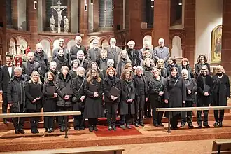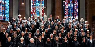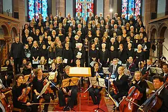 Once a year the choir performs a choral concert, since 1997 regularly on 3 October. They sang among others Mozart's Requiem, Schubert's Mass No. 5 in A-flat, Ein deutsches Requiem by Brahms, Rossini's Petite messe solennelle, Gounod's St. Cecilia Mass, and Verdi's Requiem.[5] Both Chor and Kinderchor appeared in performances of Hermann Suter's Le Laudi (1998 and 2007) and in 2004 in the German premiere of John Rutter's Mass of the Children. In 2006, Dessauer conducted Karl Jenkins' Requiem, composed in 2004.[1] In 2010, works of Bach were performed, his Mass in G minor and choral movements from cantatas BWV 140, BWV 12, BWV 120 and BWV 29.[6] In 2011 the choir sang Haydn's Die Schöpfung. The children's choir sang along with the soprano.[7]
